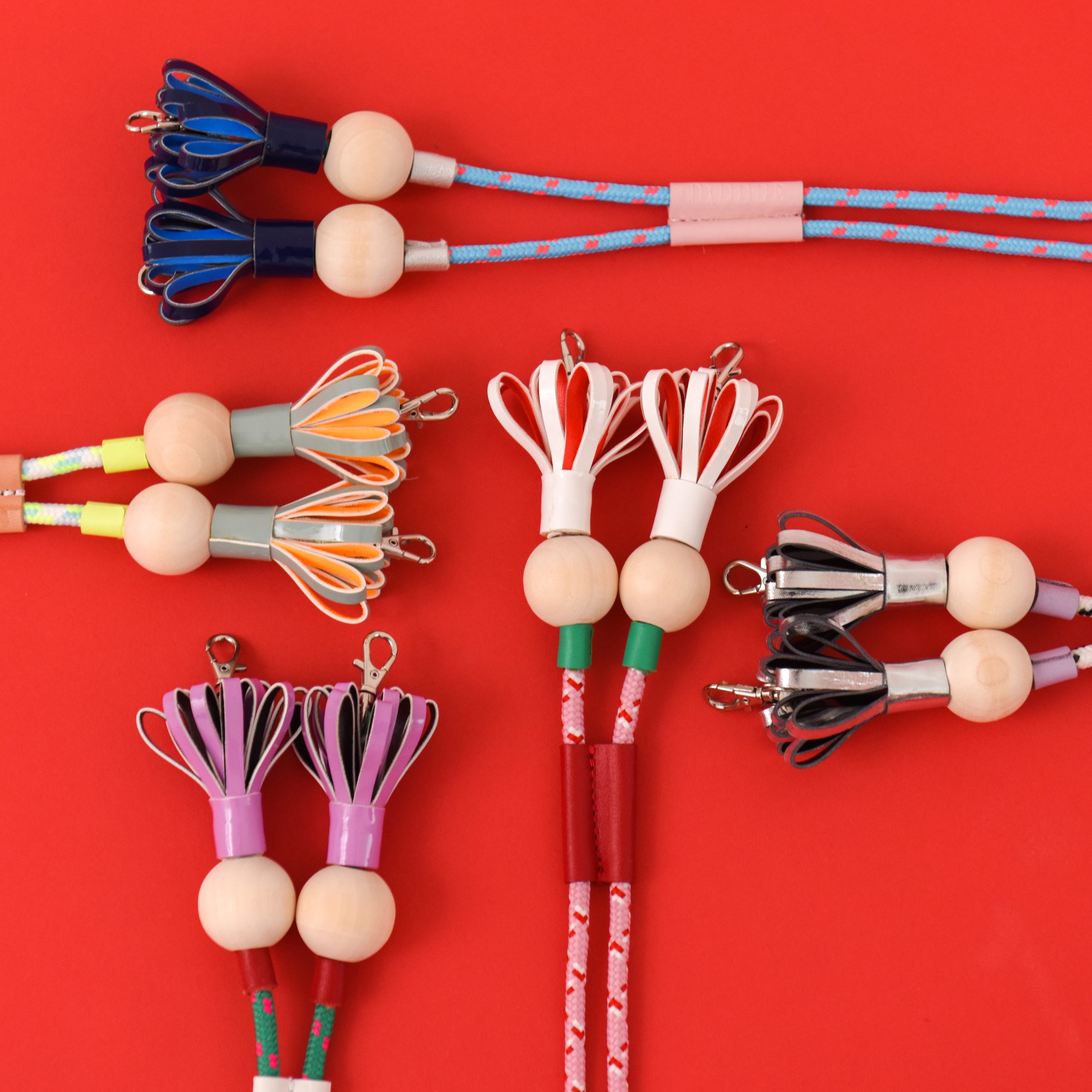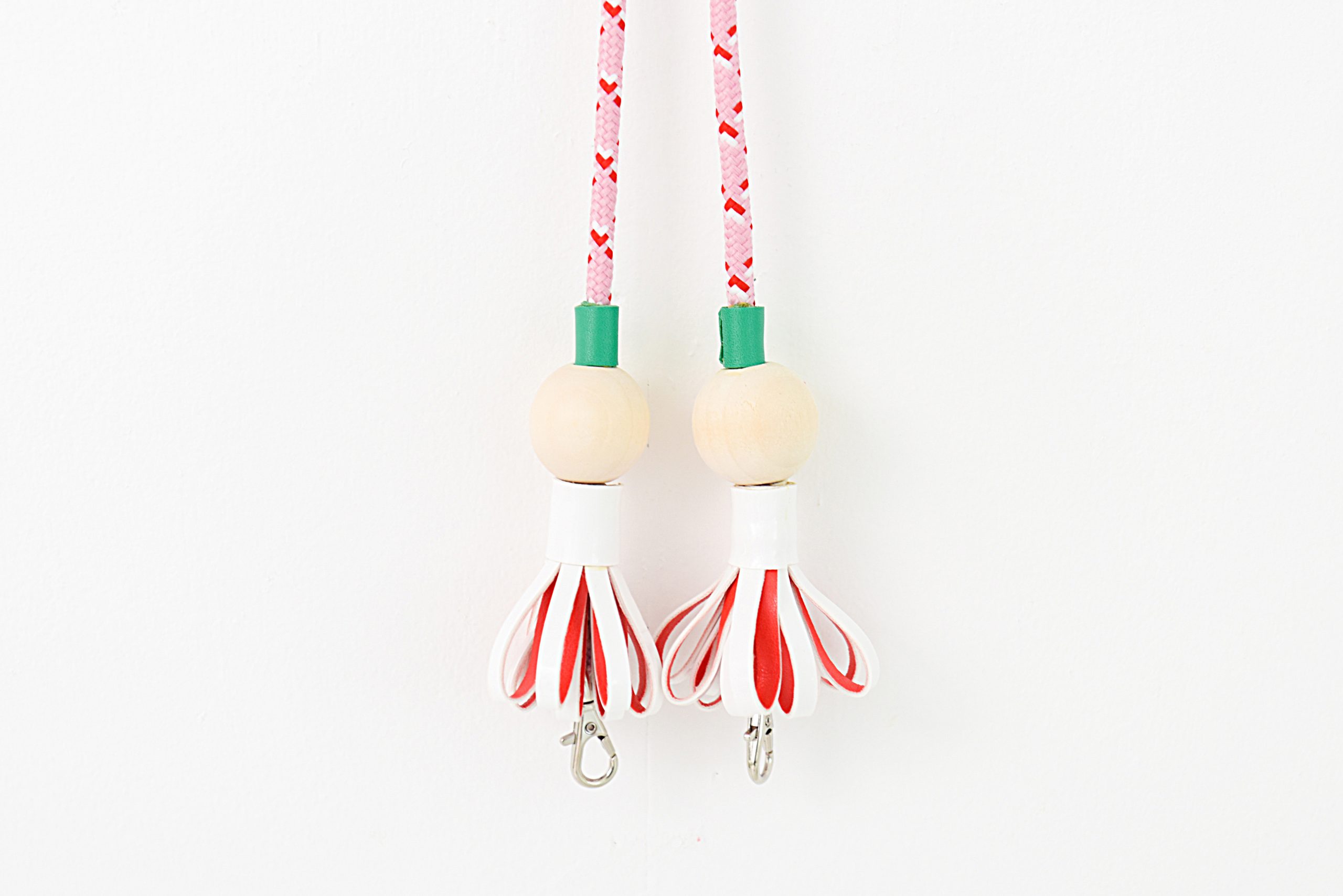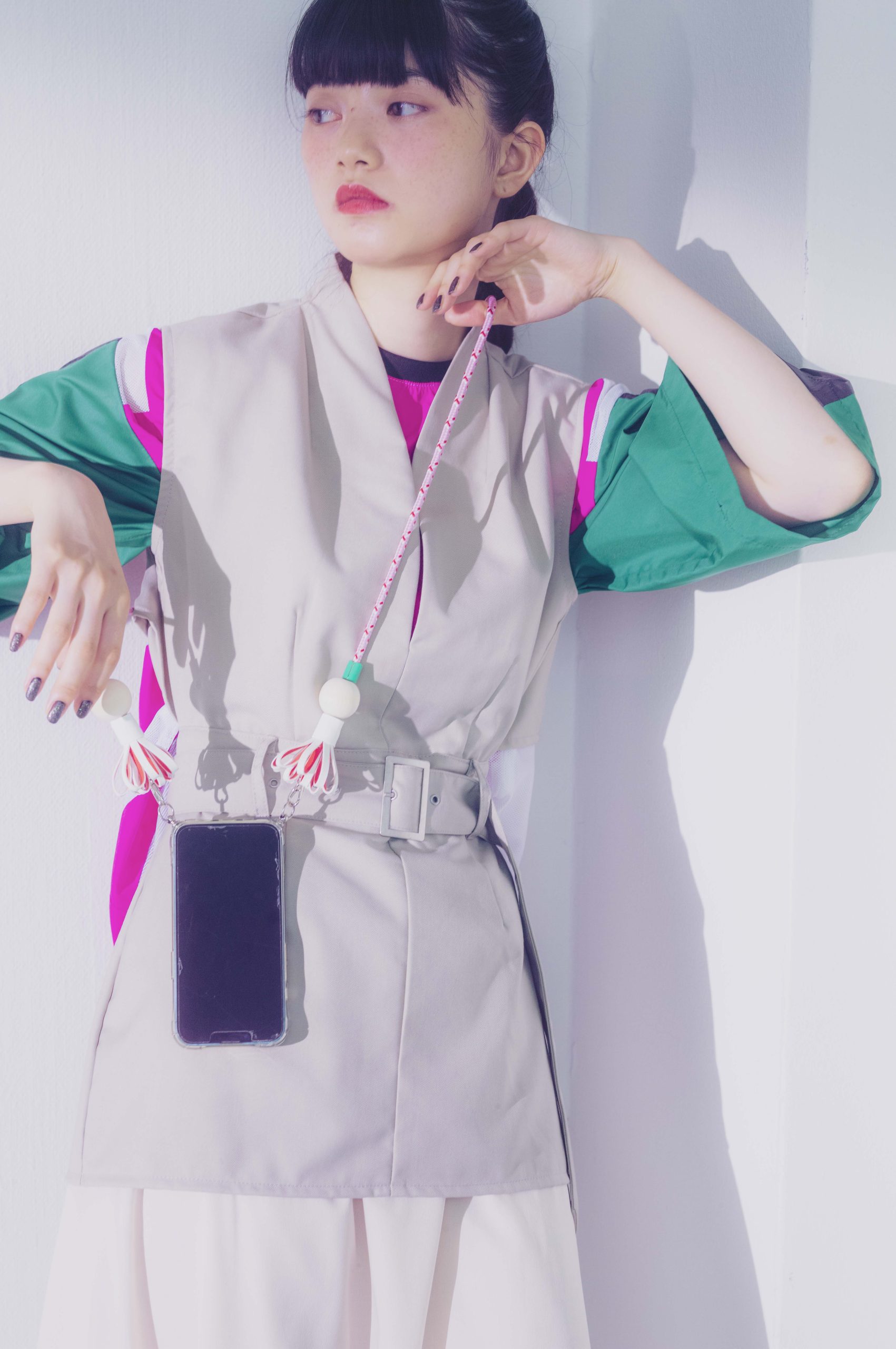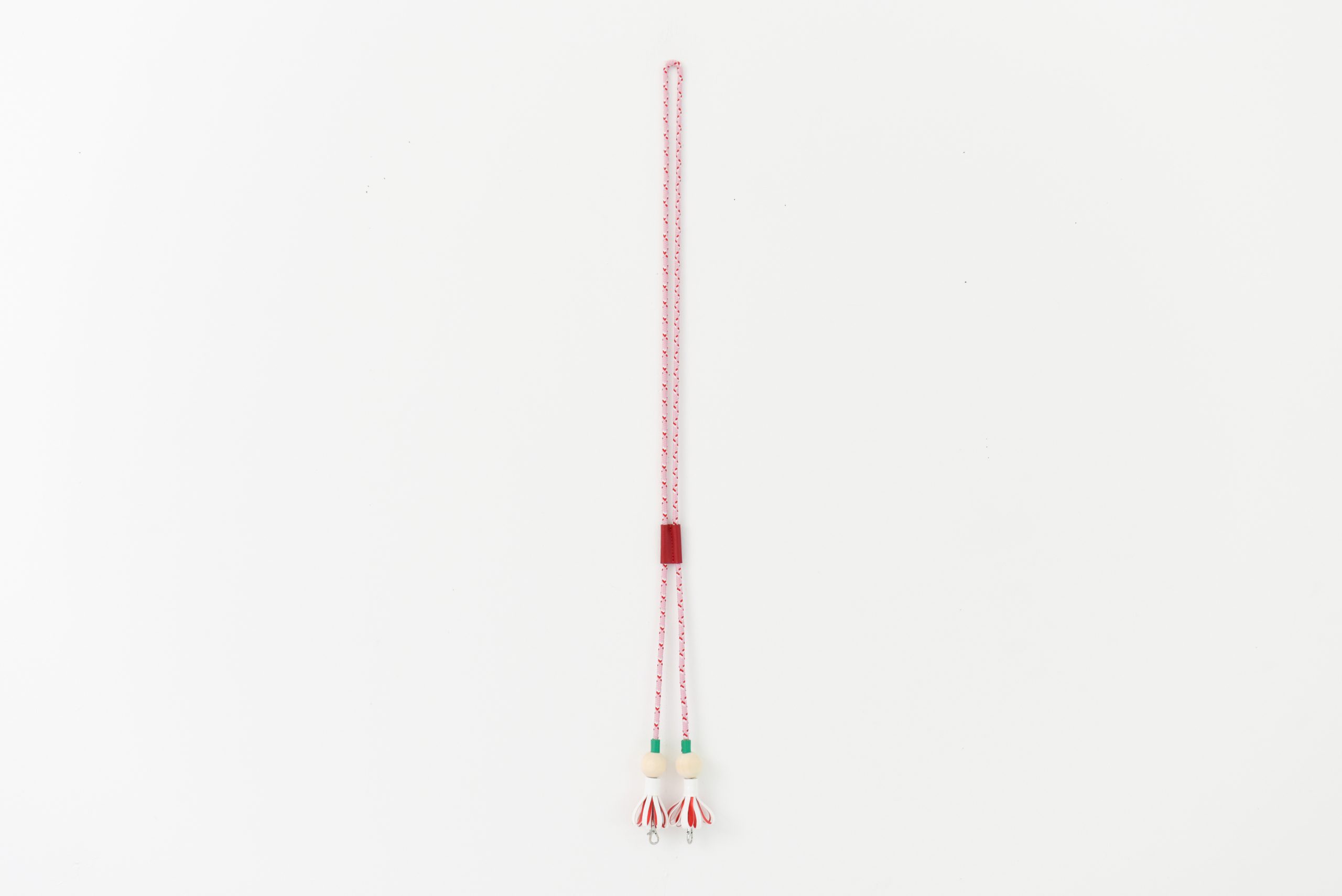 バイカラーのボンボリがアクセントに。紐の長さはたっぷり長めの150cm,紐調整でお好みの長さに。スマホストラップとしてはもちろんバッグショルダーとしてもお使いいただけます。qual:合皮エナメル、牛革、木材サイズ 長さ150cm